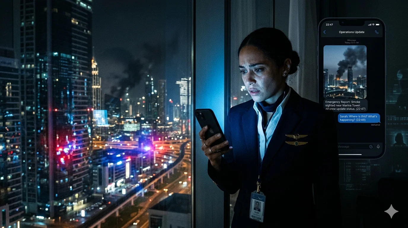 Dubai Police revealed that specialized cybercrime teams were deployed to detect and trace images circulated within private groups. In one documented case, a flight attendant shared a photo of smoke rising from a building after a regional incident. The image remained within a closed WhatsApp group of colleagues, yet authorities identified the source through active electronic monitoring and summoned the individual for questioning before placing him under arrest. A second case followed a similar pattern, where shared material inside private conversations triggered investigation and detention under state security provisions.